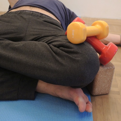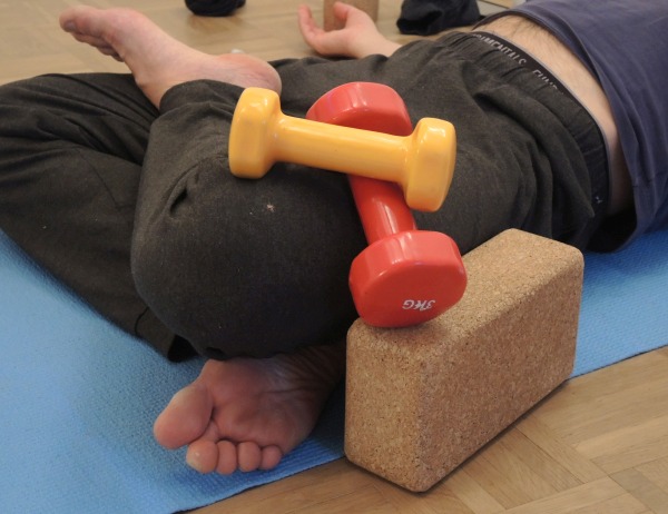 - Nimm die supta padmasana wie oben beschrieben ein, lasse Dir jedoch eine adäquat schwere Kurzhantel oder einen anderen Gegenstand wie einen Sandsack auf den Oberschenkel des oberen Beins oder auf beide Beine legen, idealerweise mit begrenzter Neigung nach außen zu rutschen.