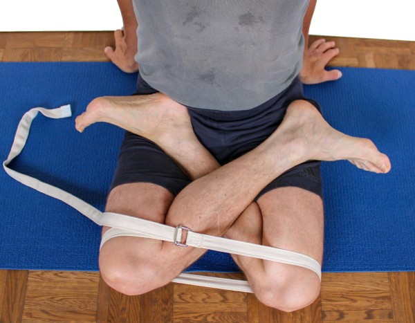 - Der Gürtel stellt nicht nur die enge Position der Knie sicher, sondern damit auch die notwendige Exorotation. Wenn die Exorotationsfähigkeit der Hüftgelenke noch eher eingeschränkt ist, wird dies natürlich zu entsprechendem Druck zwischen den Unterschenkeln und möglicherweise auch Missempfindungen in den Knien führen. Daher sollte diese Variante achtsam eingesetzt werden.