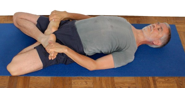 - Strecke das linke Kniegelenk ein wenig und verfahre mit dem linken Bein wie zuvor mit dem rechten: greife mit der linken Hand den linken Oberschenkel um das Bein auszudrehen und mit der rechten Hand den linken Außenfuß, um diesen auf dem rechten Oberschenkel abzulegen, auch diesen so weit als möglich außen.