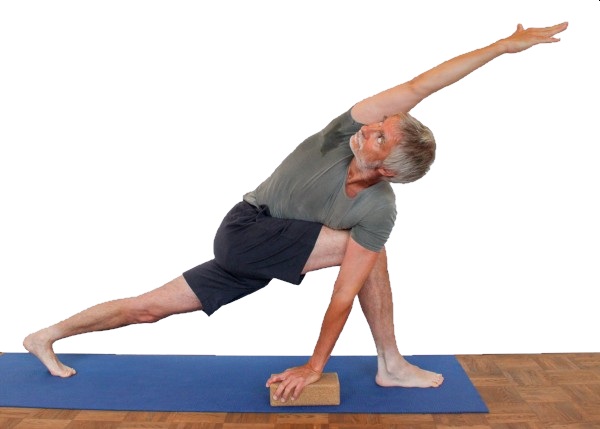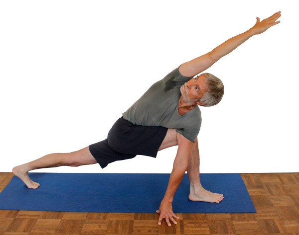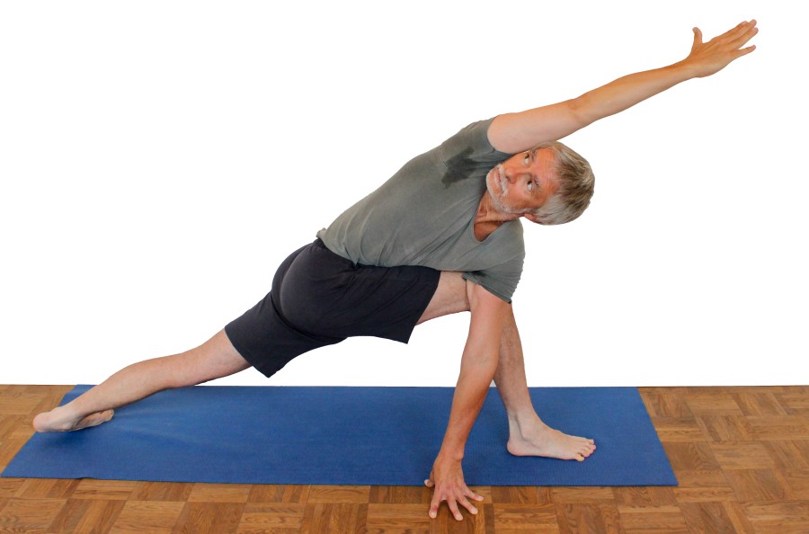 Der parsvakonasana-typische Arm ist in weit exorotierter maximaler frontaler Abduktion, was je nach Beweglichkeit Vorbereitung braucht: