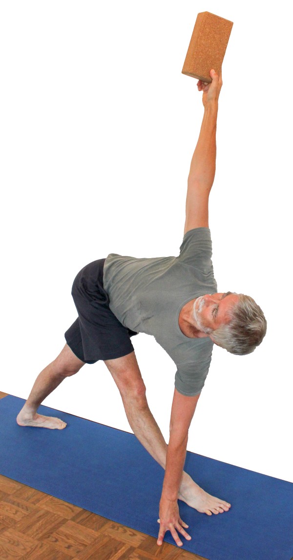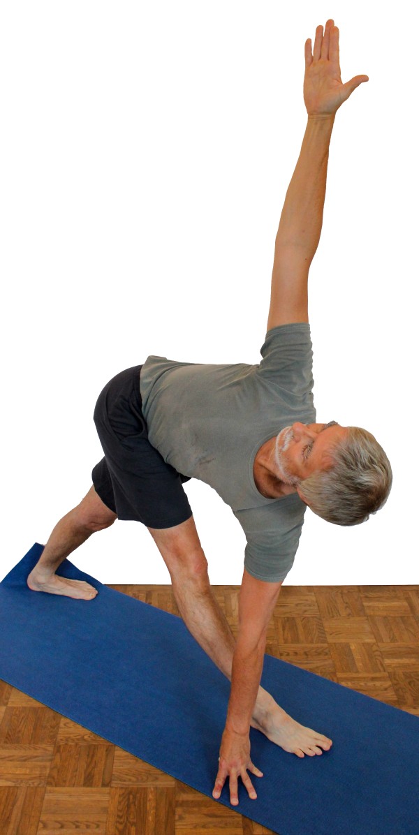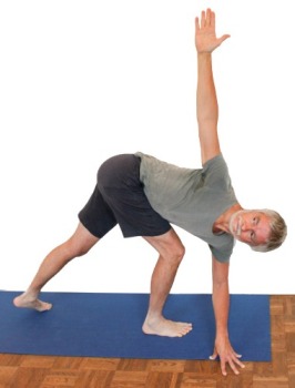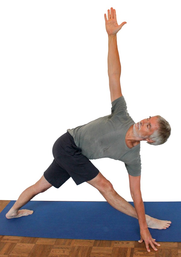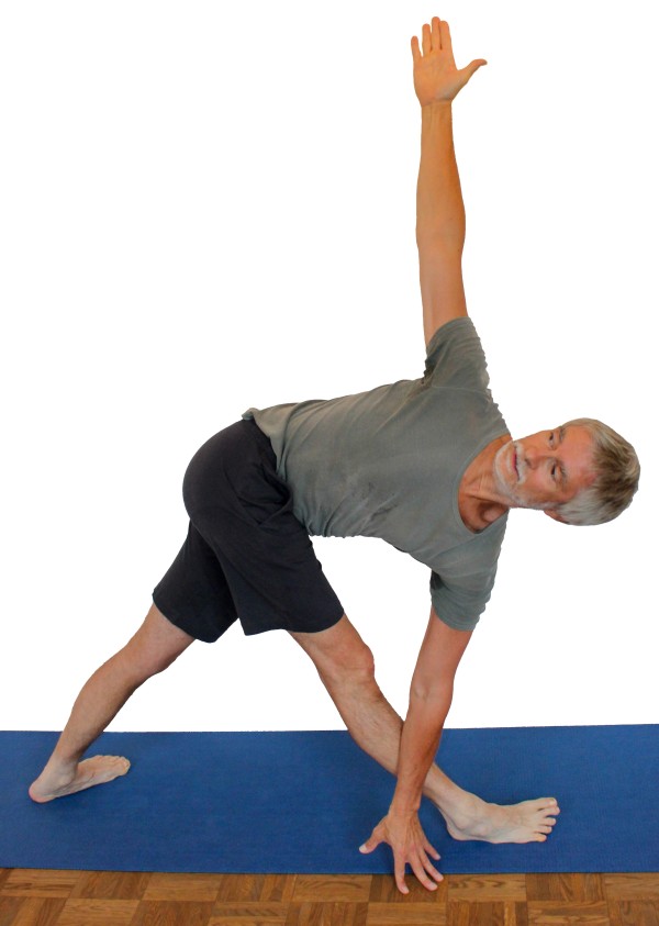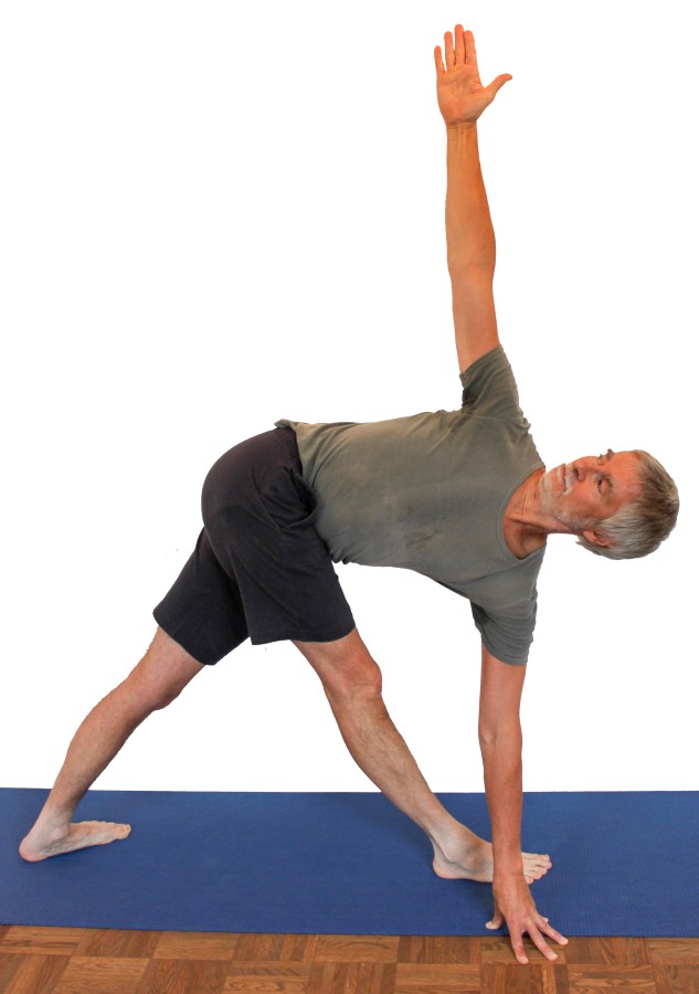 - Diese Variante stellt eine gewisse Analogie zur trikonasana mit Hand am Innenbein dar, allerdings ist es bei letzterer eher der Druck der Fingerspitzen gegen den Innenoberschenkel, der die Drehung des Oberkörpers fördert, während es hier die Frontalabduktoren des Schultergelenks sind, die den Arm nach vorne gegen das Becken drücken und damit einerseits die Drehung des Rumpfs verbessern helfen, andererseits aber auch eine weitgehende Retraktion der Schulterblätter erzeugen, die im wichtigsten Protraktor, dem Serratus anterior, eine angenehme bis – wenn verspannt oder verkürzt – intensive Dehnung verursacht. Gleichzeitig arbeitet der Deltoideus pars clavicularis in Retroversion in großer Sarkomerlänge, was seinem Ruhetonus zu Gute kommt und einige der Anforderungen des Alltags oder Sports ausgleichen kann, die seinen Tonus hochsetzen.