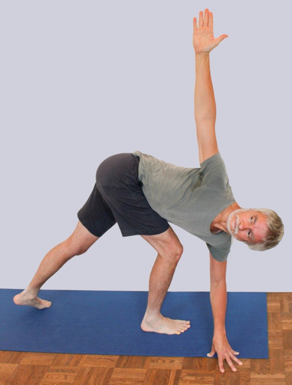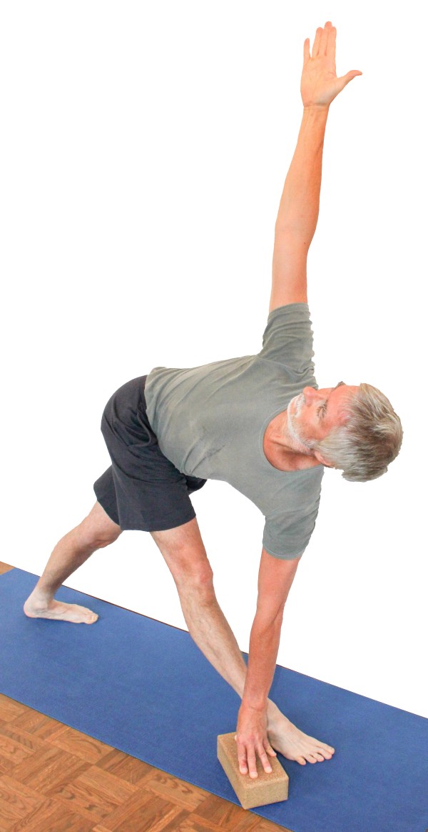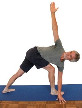 - Nimm die Haltung wie oben beschrieben ein. Wenn die Beweglichkeit nicht hinreicht, um die Fingerspitzen im Außenfußbereich auf dem Boden aufzusetzen, drücke statt einen Klotz zu benutzen, in dieser Variante mit der Hand von außen gegen den Unterschenkel um den Oberkörper mit kräftig unterstützendem Arm drehen zu können.