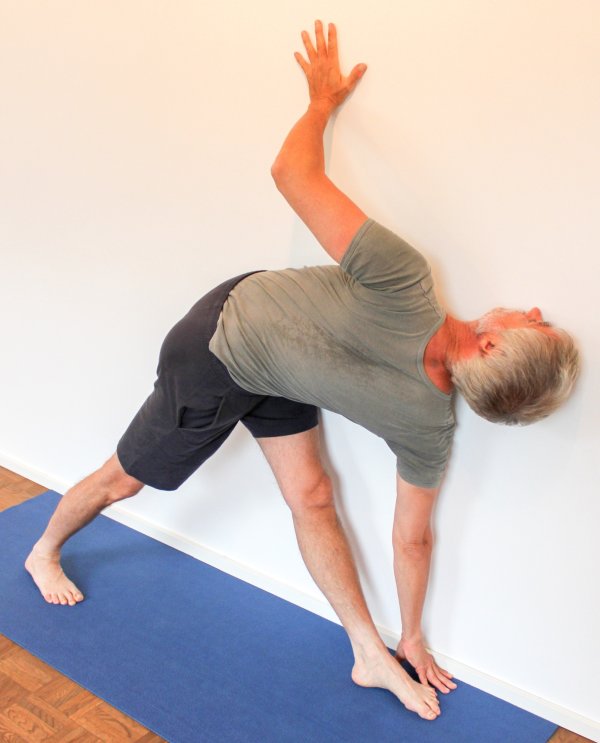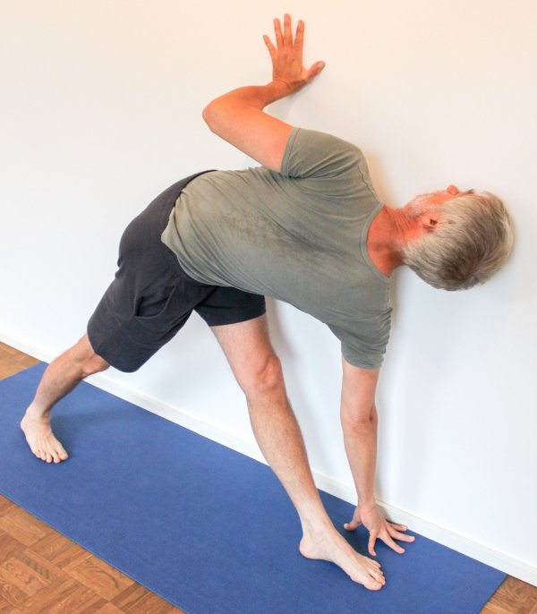 - Achte darauf, dass die Kräfte, die die beiden Arme ausüben, in einem günstigen Verhältnis stehen. Drückt die obere Hand kräftiger, weil diese Bewegung leichter fällt, wird der Körper von der Wand weg gedrückt. Würde die untere Hand kräftiger als die obere arbeiten, so würde das keine Stabilität kosten, jedoch wäre der nutzbare Spielraum zur Drehung nicht voll ausgenutzt, außer die Dehnungsempfindung wäre ohnehin am Limit.
