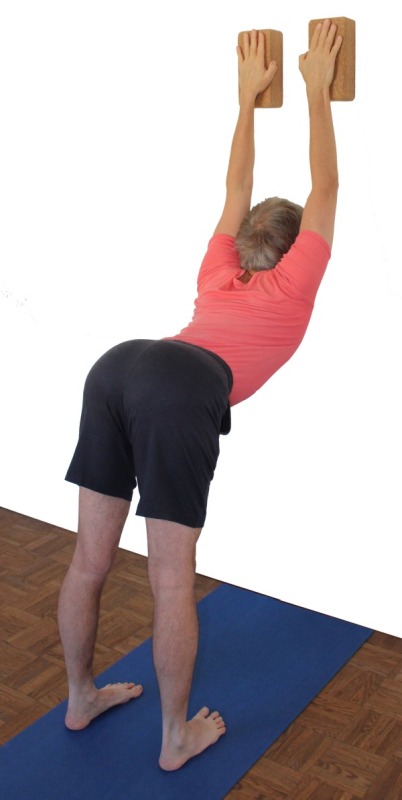 - Nimm die Haltung wie oben beschrieben ein, drücke aber mit jeder Hand einen aufrecht gehaltenen Klotz gegen die Wand.
