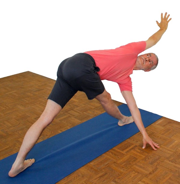 - Für eine gute Stabilität kann der hintere Fuß um 30-45° schräg gesetzt werden wie er auch in parivrtta trikonasana steht, zu der diese Variante eine große Ähnlichkeit aufweist.