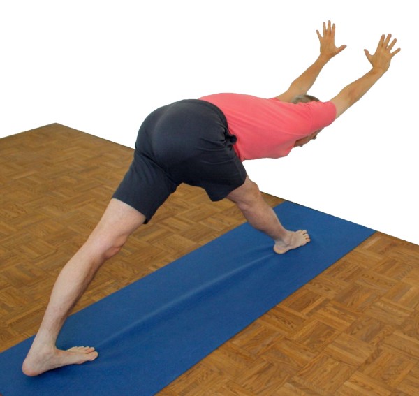 - Nimm die Rückenausstreckung in Schrittstellung wie oben beschrieben ein.