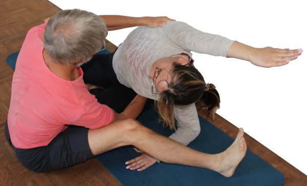 - Der zweite Supporter steht vor dem Ausführenden und greift mit den Händen von beiden Seiten um den Oberkörper um diesen nach Verträglichkeit weiter in die Lateralflexion zu biegen.
