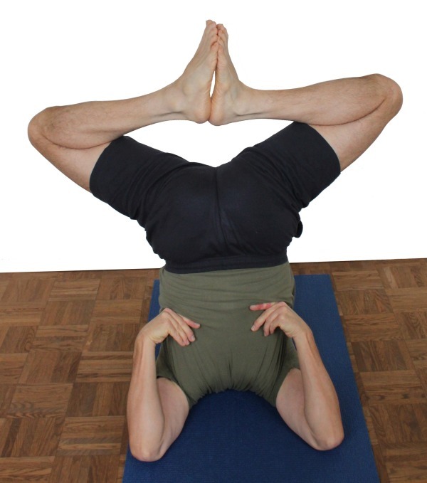 - Halte einen Klotz zwischen den Oberschenkeln und nimm karnapidasana oder halasana ein.