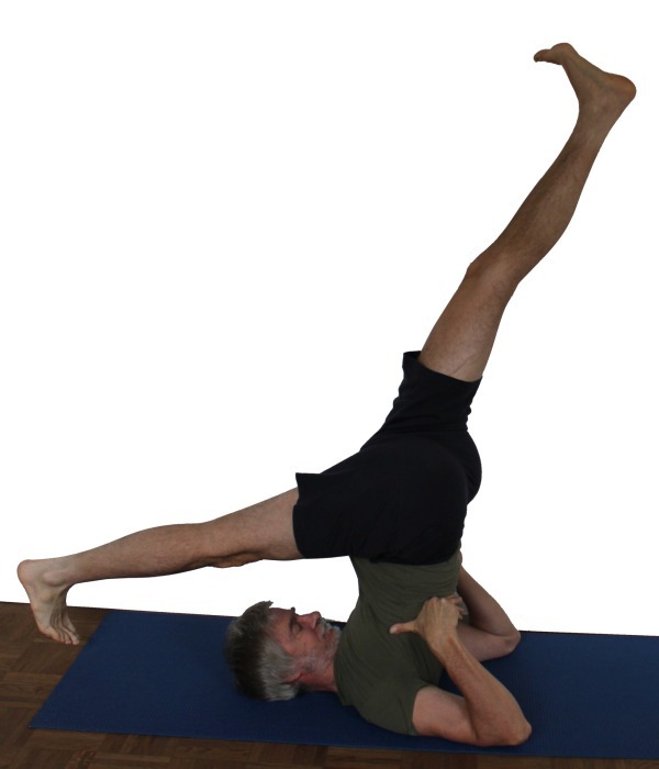 - Nimm die oben beschriebene eka pada Variante des Schulterstands ein.