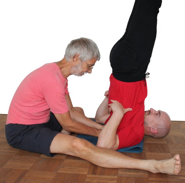 - Der Druck gegen das Becken darf keinesfalls dazu führen, daß die HWS des Ausführenden überfordert wird. Es gibt zwei Herangehensweisen: einerseits kann zuerst das Becken in Position gebracht werden, also bis der Oberkörper im Schnitt senkrecht ist bzw. falls das vorher eintritt, bis die HWS eine Grenze setzt, andererseits können zuerst die Beine aus dem Gesichtsfeld heraus gezogen werden und danach die Position des Beckens korrigiert. In der Praxis sollte sie die erste Möglichkeit als die günstigere erweisen, wenn darauf geachtet wird, daß die Korrektur der Beckenposition nicht zu einer deutlichen Bewegung der Beine hin zum Kopf führt bzw. diese begrenzt wird.