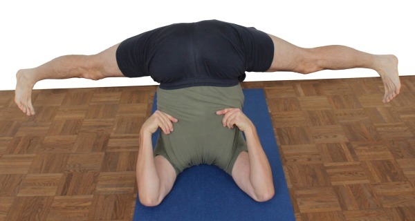 - Gehe langsam zur rechtwinkligen Variante ein, indem Du die Abduktion in den Hüftgelenken sukzessive aufhebst und soweit nötig das Becken dazu vom Kopf weg verlagerst.