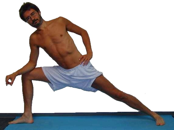 - Drücke wie in den beiden verwandten Haltungen parsvakonasana und Kriegerstellung 2 den Außenfuß des streckenden Beins auf den Boden, drehe das streckende Bein b.a.w. maximal aus, strecke es ganz durch und bewege es maximal nach hinten, um die korrekte Position der Hüfte des streckenden Beins zu fördern. Wie in den beiden verwandten Haltungen zieht auch hier die Pomuskulatur des beugenden Beins das entsprechende Knie nach hinten.