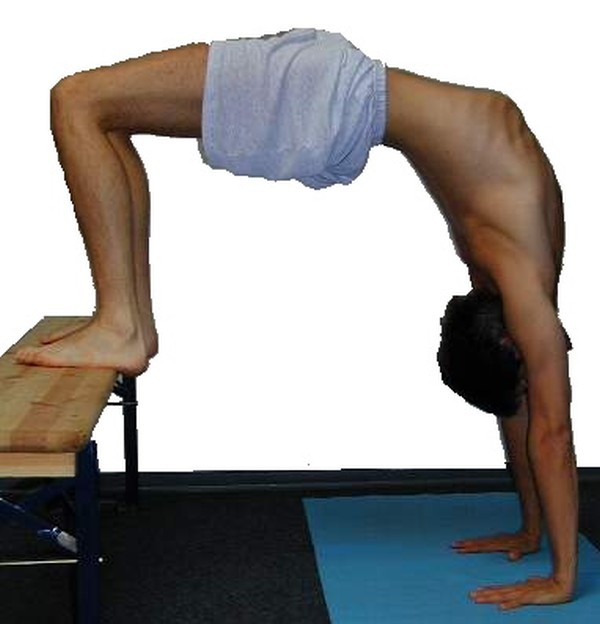 - die Füße auf der Bank sind die Umkehrung der obigen Variante mit den Händen auf der Bank und führen zu deutlich mehr Krafteinsatz der Arme. Wenn die Kraft der Arme und Schultern nicht hinreicht, kann und sollte diese Haltung nicht ausgeführt werden. Der überwiegende Teil des Körpergewichts ruht auf den Händen, weshalb v.a. Trizeps und Deltoideus ungleich mehr Arbeit leisten müssen als in der normalen Brücke am Boden. Das Anheben des Oberkörpers ist für viele Menschen deutlich schwer. Sind die Arme erst einmal weitgehend gestreckt, wird es immer leichter und das Stehen selbst ist nicht mehr sehr schwer, zumal weniger Beweglichkeit in den Schultern erforderlich ist. Die hauptsächliche Krümmung des Körpers geschieht hier eher in Form von Extension in den Hüftgelenken und als Extension der Wirbelsäule.