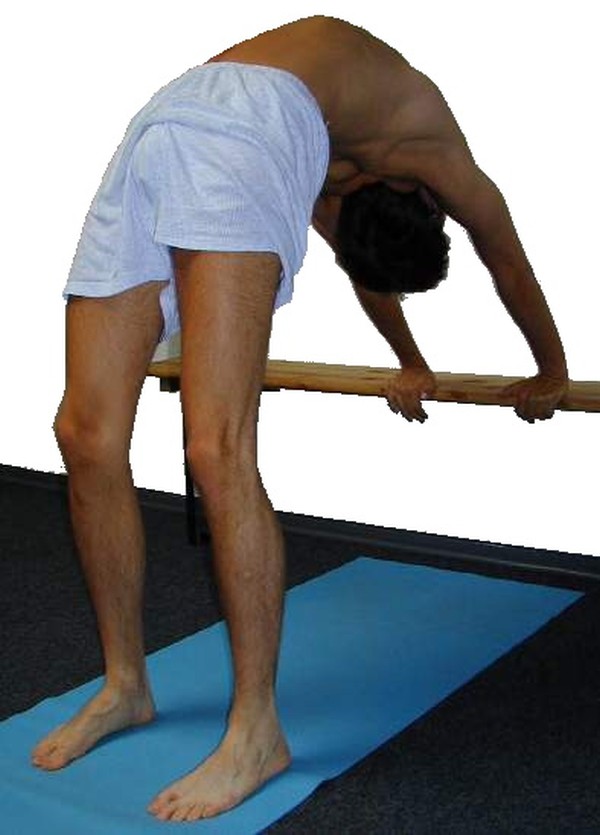 - mit dem Einnehmen der Haltung, also mit dem Anheben des Oberkörpers und der entsprechenden Bewegung der Beine rollen die Füße immer mehr auf die Bank, bis schließlich bei eingenommener Haltung die Fußsohlen ohne die Fersen auf der Bank stehen. Zu Beginn ist eine deutliche Mitwirkung der Ischiocruralen Gruppe beim Anheben des Oberkörpers gegeben. Sollte dabei eine Krampfneigung in dieser auftreten, kann der Abstand der Hände von der Bank ein wenig vergrößert werden.