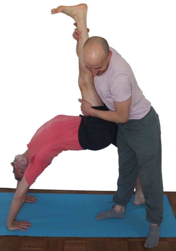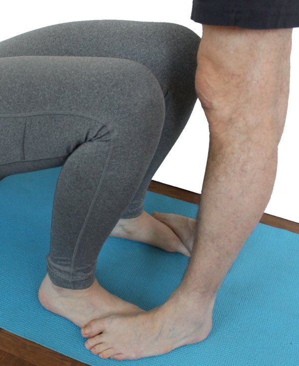 - Nimm die eka pada-Variante wie oben beschrieben ein. Der Supporter steht auf der Seite des gehobenen Beins und legt dessen Achillessehne auf seine Schulter.