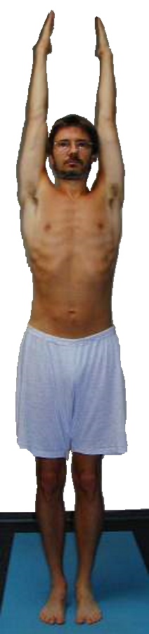 - Stehe in tadasana. Drehe Oberarme und Unterarme b.a.w. maximal aus und führe die Arme über seitwärts (laterale Abduktion) nach oben bis die Arme parallel sind.