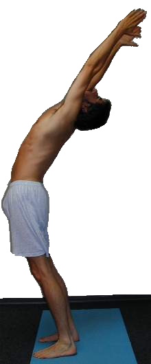 - Wie in der tadasana gibt der Hüftbeuger-Beweglichkeitstest Aufschluss darüber, ob Aufrichtung des Beckens bei gleichzeitig gestreckten Kniegelenk möglich oder unmöglich ist. Tendenziell wird die Hohlkreuzneigung hier etwas größer sein als in tadasana. Das resultiert daraus, dass die angehobenen Arme zu einem Zug des Latissimus dorsi am hinteren Beckenkamm führen, aber auch daraus, dass die Bewegung der Arme nach hinten mit der Extension der BWS und die wiederum mit der Lordosierung der LWS assoziiert ist.