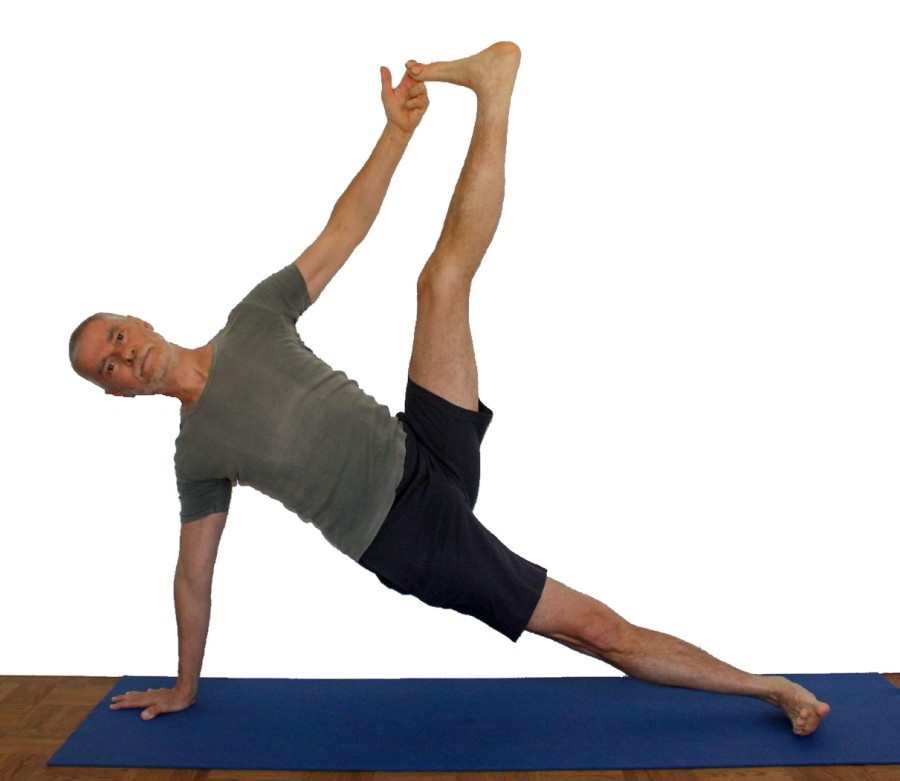- Diese Variante ist aus mehreren Gründen schwieriger als die entsprechende Variante der ardha vasisthasana. Einerseits stützt das gehobene Bein nicht mehr mit ab, sondern muß balanciert werden, andererseits erreicht es wegen der Beweglichkeitseinschränkungen der Adduktoren meist nicht die Frontalebene des Körpers ist.
