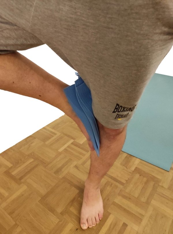 - Nimm die Haltung wie oben beschrieben ein, lege aber ein Patch zwischen den Fuß und den Innenoberschenkel.