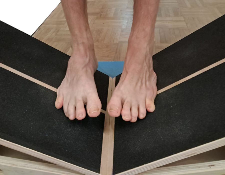 - Stelle dich mit beiden Füßen auf das jeweilige Slantboard, so daß die Fußmittellinien etwa parallel sind und die Füße einen möglichst geringen Abstand haben, ohne sich berühren zu können. Die sich ergebende Fußstellung ist dabei jeweilg deutlich proniert.